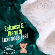 Introducing the must-have addition to your home - the teal green colored faux fur blanket that is super soft and has a white sherpa back side that looks like sheepskin . Not only will it make your room look cozy and stylish, but it is also incredibly comfortable and perfect for snuggling up under on a chilly evening.