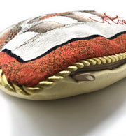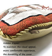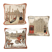 Take a bike ride through Italy with this imaginative cushion cover, Beautifully and artistically Woven! this cushion cover is great for any home. The front of the pillowcase is a strong, firm upholstery fabric that will take the wear and tear of a room where people live. The back of the pillow is a soft tan fabric. The whole case is edged in a gold cord which gives it a feeling of elegance