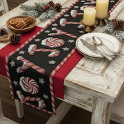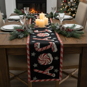 Starry Peppermint Design: Featuring a whimsical tapestry of festive peppermint swirls, candy canes, and shimmering stars on a classic black backdrop, this table runner brings holiday spirit to life. Its vibrant design captures the essence of Christmas, setting a joyful tone for your celebrations.