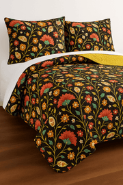 Elevate your bedroom décor with the DaDa Bedding Bohemian Floral Garden Quilted Bedspread Set. This stunning bedding ensemble features a richly detailed floral garden pattern in honey yellow, mustard, burnt orange, emerald green, teal and chocolate brown on a charcoal‑black canvas. It blends boho chic style, rustic farmhouse charm, vintage‑inspired design and cottagecore elegance to create a versatile statement piece for modern, eclectic, global or transitional interiors.